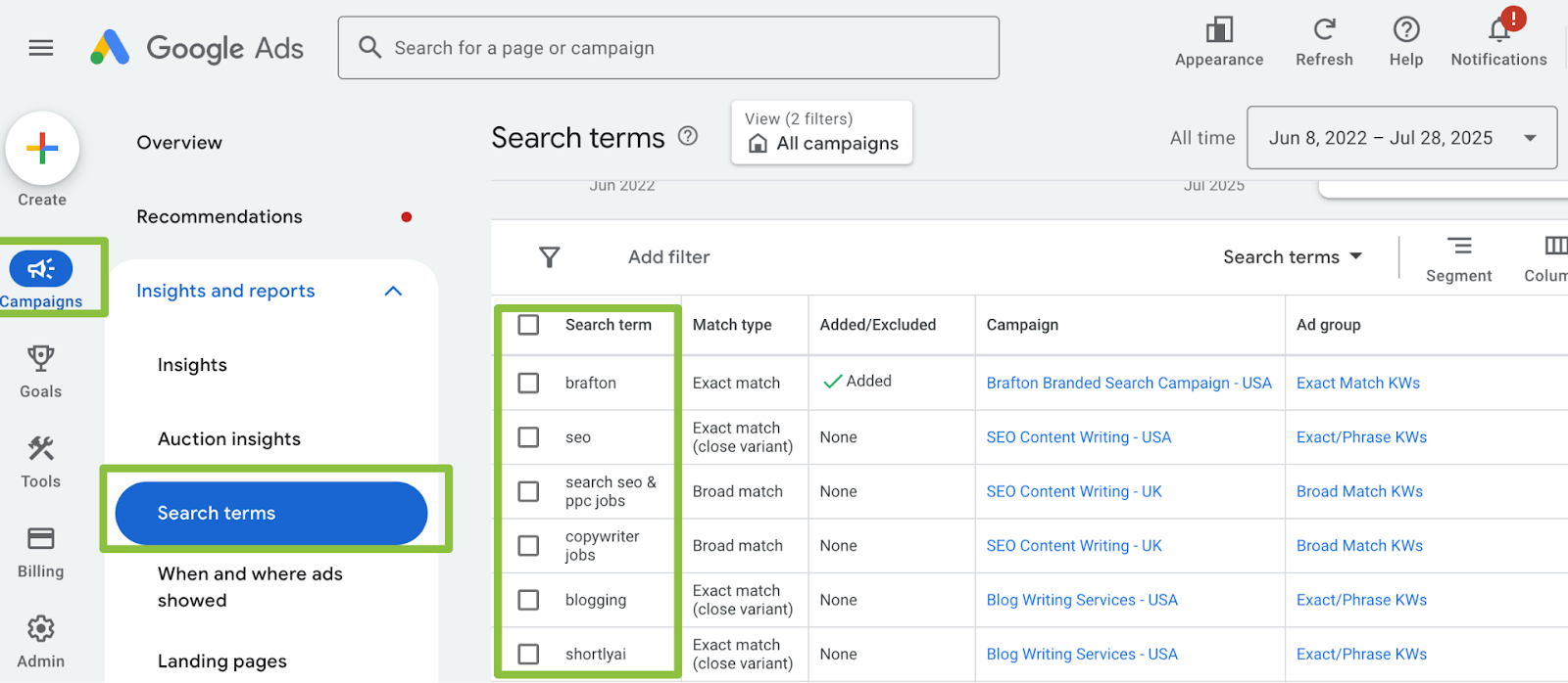 To understand what’s driving those impressions, open the Search Terms Report. This shows which search queries are triggering your ads, and whether those clicks are coming from Google Search or its Search Partners. Use this report to add relevant keywords, weed out irrelevant traffic and refine your targeting.